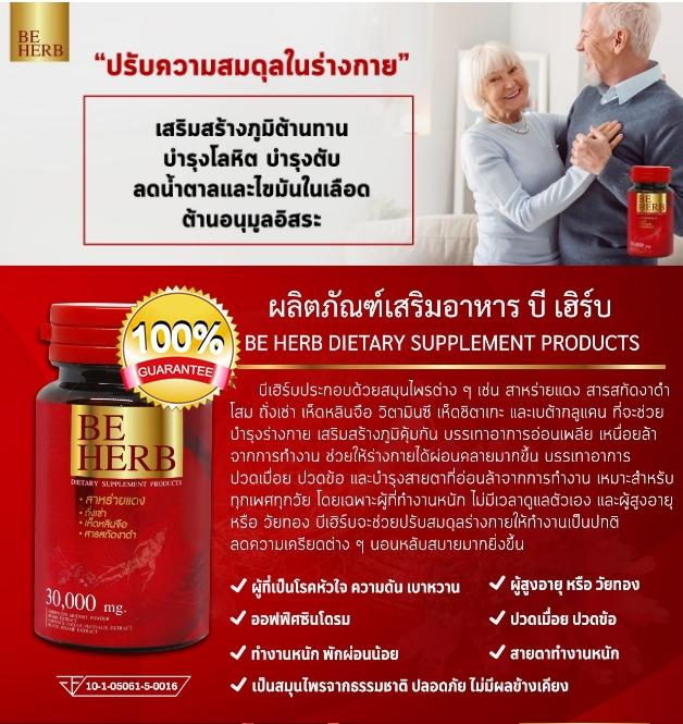 ผลิตภัณฑ์อาหารเสริม สมุนไพรสกัดจาก สาหร่ายแดง สารสกัดงาดำ โสม ถั่งเช่า เห็ดหลินจือ วิตามินซี เห็ดชิตาเกะ และเบต้ากลูแคน มีส่วนช่วยบำรุงร่างกาย เสริมสร้างภูมิคุ้มกัน บรรเทาอาการอ่อนเพลีย เหนื่อยล้า จากการทำงาน ช่วยให้ร่างกายได้ผ่อนคลายมากขึ้น บรรเทาอาการ ปวดเมื่อย ปวดข้อ และบำรุงสายตาที่อ่อนล้าจากการทำงาน เหมาะสำหรับ ทุกเพศทุกวัย โดยเฉพาะผู้ที่ทำงานหนัก ไม่มีเวลาดูแลตัวเอง และผู้สูงอายุ หรือ วัยทอง บีเฮิร์บจะช่วยปรับสมดุลร่างกายให้ทำงานเป็นปกติ ลดความเครียดต่าง ๆ นอนหลับสบายมากยิ่งขึ้น เป็นสารสกัดจากธรรมชาติ ปลอดภัย ไม่มีผลข้างเคียง